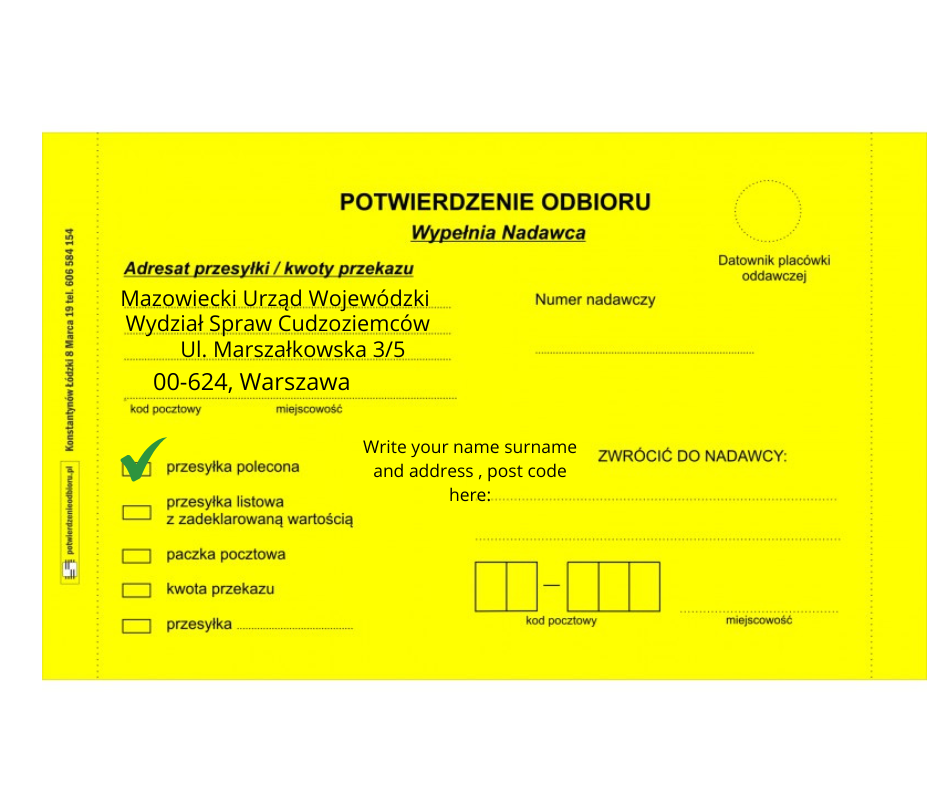 - the yellow postal slip (PNG PL/EN) – attach it to the back of the envelope. The Department of Foreigners will send it back to you after receiving your application.